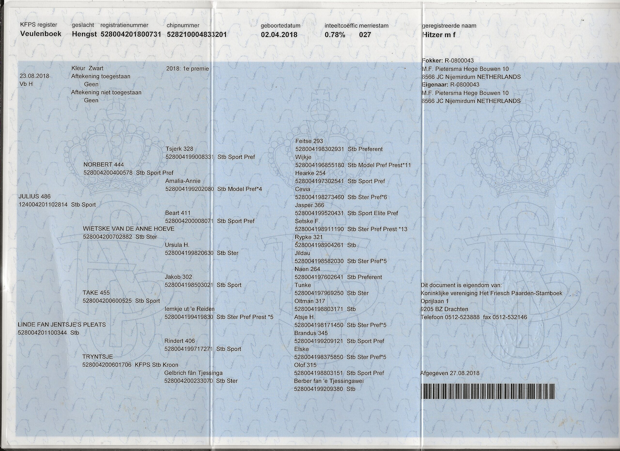Hitzer is een mooie royale, kwaliteitsvolle ruin uit stam 27. Zijn moeder is een AAA merrie van Take 455, zijn grootmoeder is een Kroon Prestatie AA merrie en zijn overgrootmoeder is ster. De halfzus van Hitzer zijn moeder is de bekende Model Sport AA merrie Thirsa fan Jentsje’s pleats. Hij komt uit een goed fokkende stam.