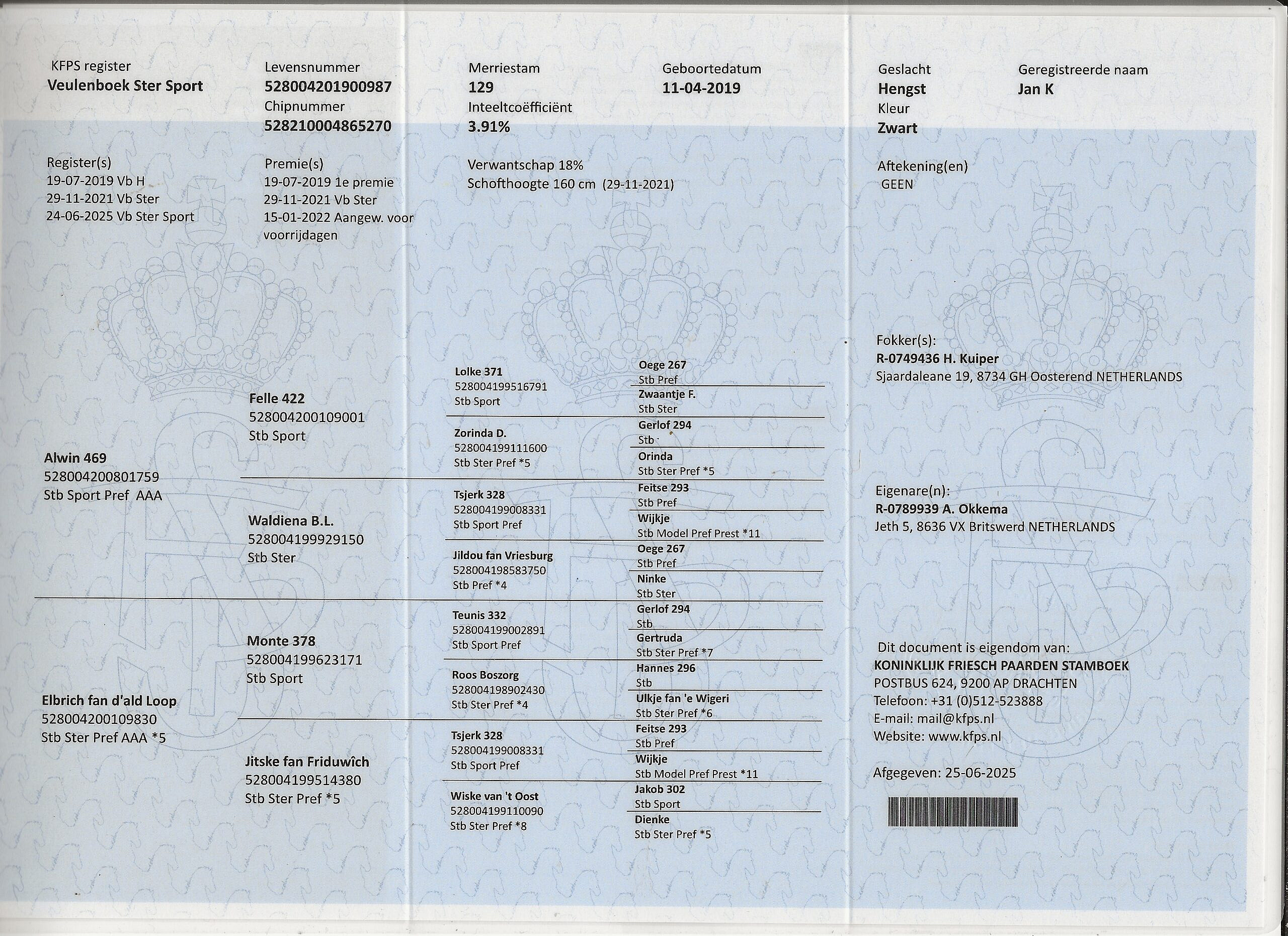 Jan is een ster dubbel sport hengst van Alwin 469 uit stam 129. Hij is gefokt door fokker van het jaar 2019 Hendrik Kuiper. Jan zijn moeder is de Ster Preferente AAA merrie Elbrich fan d’ald Loop. Deze merrie heeft als 3-jarige de ABFP test gelopen. In de rijproef haalde ze een 8 op haar draf. Ze kreeg een 9 voor haar tuigproef. Jan zijn zus Teakje K Ster haalde ook een AAA op haar ABFP-test met 84 punten. Voor Elbrich in de moederlijn komen 4 ster preferente merries op rij.