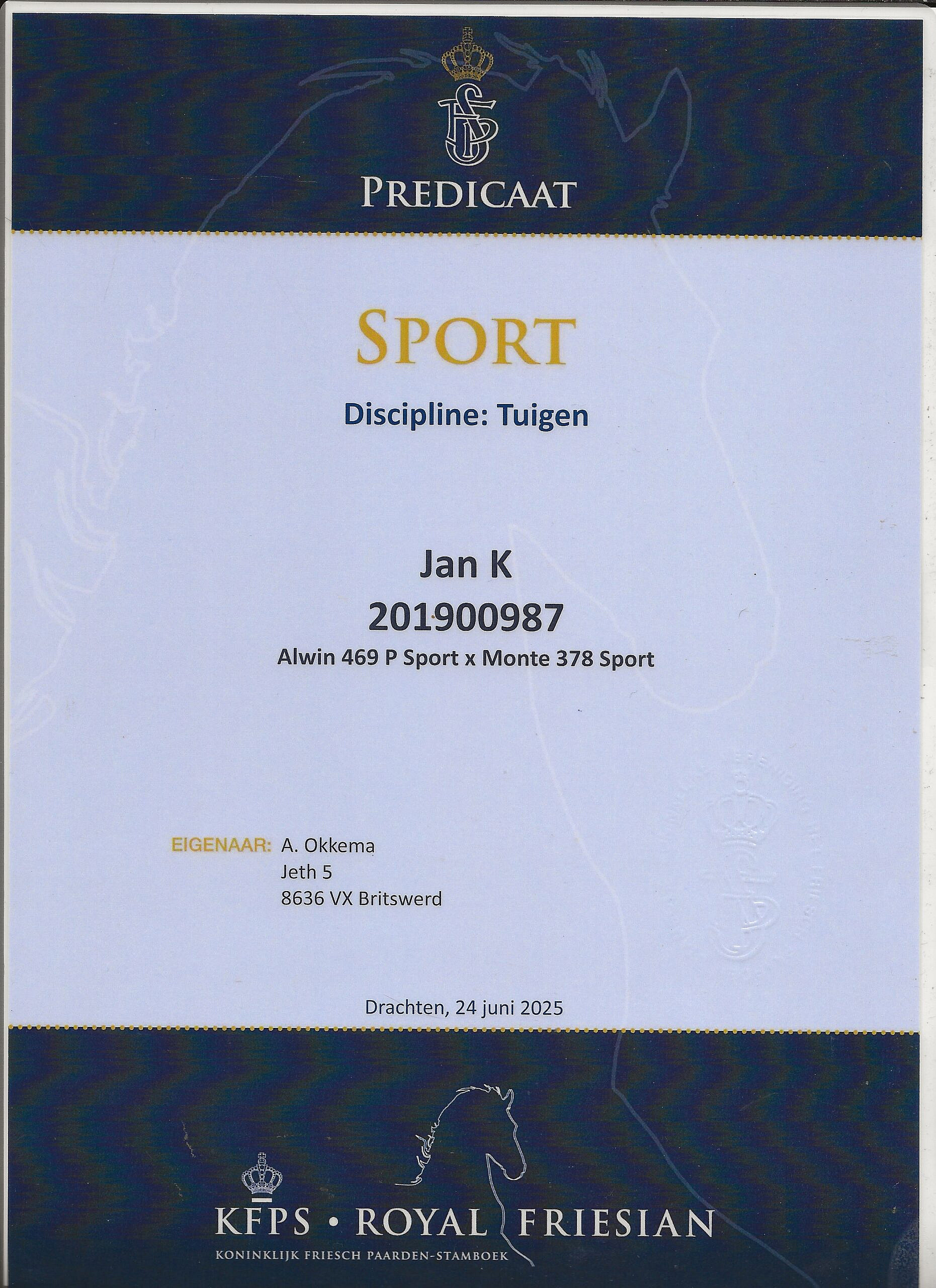 Ook voor shows draait Jan zijn hand niet om, zo heeft hij zowel in 2025 als 2026 meegelopen in de show van het KFPS tijdens de hengstenkeuring in januari. Ook tijdens de KWPN hengstenkeuring in Den Bosch was Jan één van de paarden in het showblok. Jan werd in de zomer van 2025 Nederlands Kampioen in de klasse M2 dressuur en tevens Reserve Nederlands Kampioen dubbelspan tuigen in handen van Jelte Hoekstra die ook het sportpredicaat tuigen met hem heeft behaald. Jelte was toen nog maar 16(!) jaar! Dat zegt genoeg over het geweldige karakter van deze alleskunner; koel, betrouwbaar en hij wil graag voor je werken!