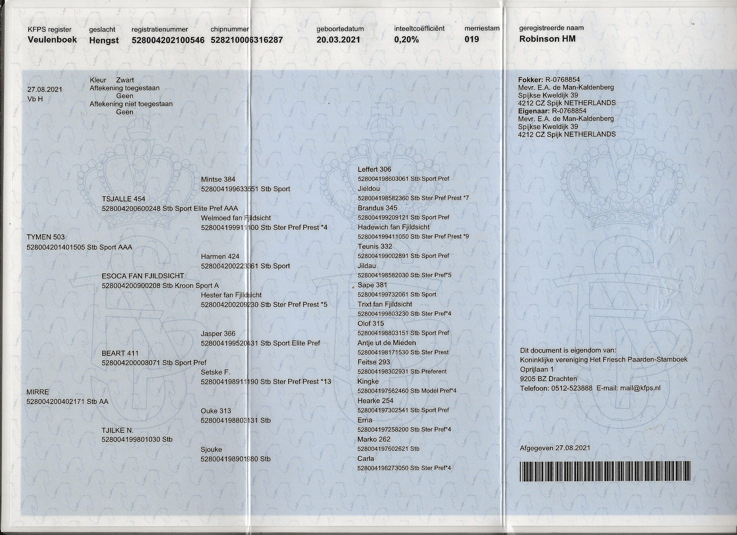 Robinson is een mooie verschijning, hij heeft een helder hoofdje, mooie hals, al veel behang en is correct gebouwd. Robinson heeft 3 goede gangen waarbij zijn draf met veel houding opvalt. Hij is beleerd onder het zadel en voor de kar en lijkt echt een talentje voor de toekomst! Tevens heeft hij een vriendelijk en eerlijk karakter